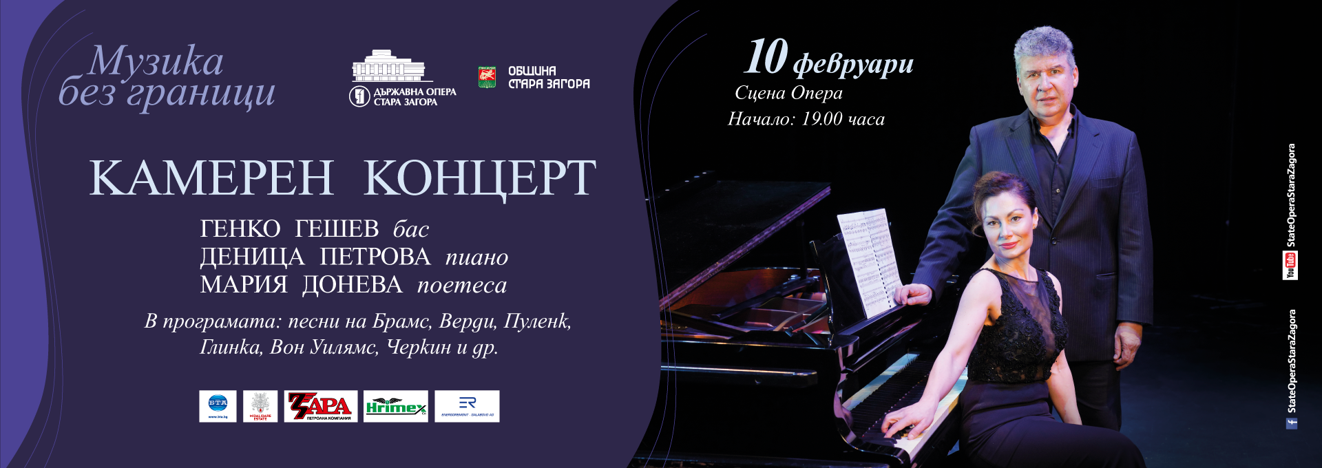 В първия за 2023 година камерен концерт от бутиковата серия „Музика без граници”,  басът с международна кариера Генко Гешев, заедно с пианистката Деница Петрова и поетесата Мария Донева, ще представи песни на седем езика от творчеството на Брамс, Верди, Пуленк, Глинка, Вон Уилямс, Черкин, както и творби от китайски композитори. Събитието ще се състои на 10 февруари, от 19.00 часа, на сцената на Операта в Стара Загора.