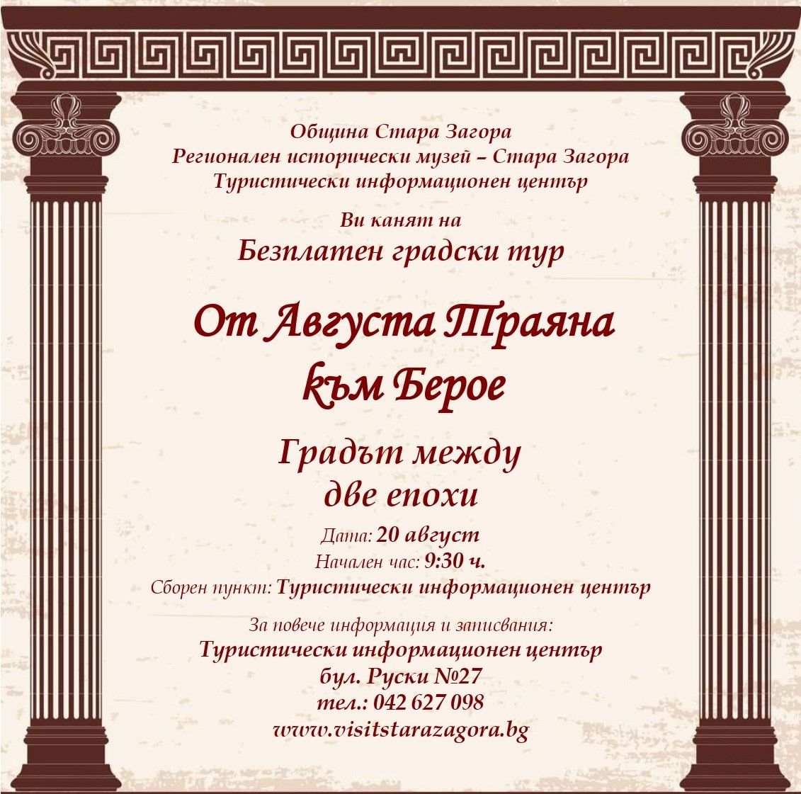 На 20 август /събота/, от 9:30 часа ще се проведе поредната вълнуваща обиколка от инициативата „Стара Загора – неразказани истории по правите улици“.Темата на маршрута е „От Августа Траяна към Берое. Градът между две епохи“. Разказът на Мария Камишева, уредник „Антична археология“ в РИМ – Стара Загора, ще ни върне назад във времето на прехода между Класическата римска епоха и Късната античност. Любителите на историята ще се запознаят с интересни факти за създаването и устройството на град Августа Траяна, както и с важните промени, които настъпват в живота на хората.