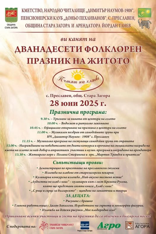 Кметството на с. Преславен, местното НЧ „Димитър Наумов – 1908“, пенсионерският клуб „Доньо Пехливанов“ и Община Стара Загора канят на 12-и фолклорен празник на житото „Пътят на хляба“. Той ще се проведе на 28 юни 2025 г.