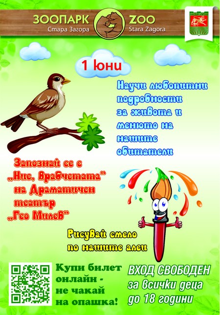Вход свободен за децата до 18 години, запознанство с „Ние, врабчетата“ и още куп изненади ще предложи на своите посетители старозагорският зоопарк на 1 юни. Началото на празничната програма по повод Международния ден на детето започва в 11.00 часа. Малките любители на животните ще се запознаят с особености от живота и менюто на обитателите на зооградината, а след това ще помогнат и в приготвянето на техния обяд.