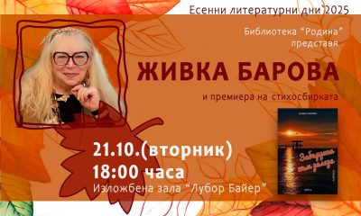 Старозагорската поетеса Живка Барова, популярна още и като педагог и журналист, ще представи тази вечер пред изкушената от литературата аудитория своята седма книга. Събитието започва в 18.00 часа, а мястото е изложбената зала „Лубор Байер“. Новата стихосбирка на Живка Барова е озаглавена „Забързана към залеза“ и включва 80 стихотворения.