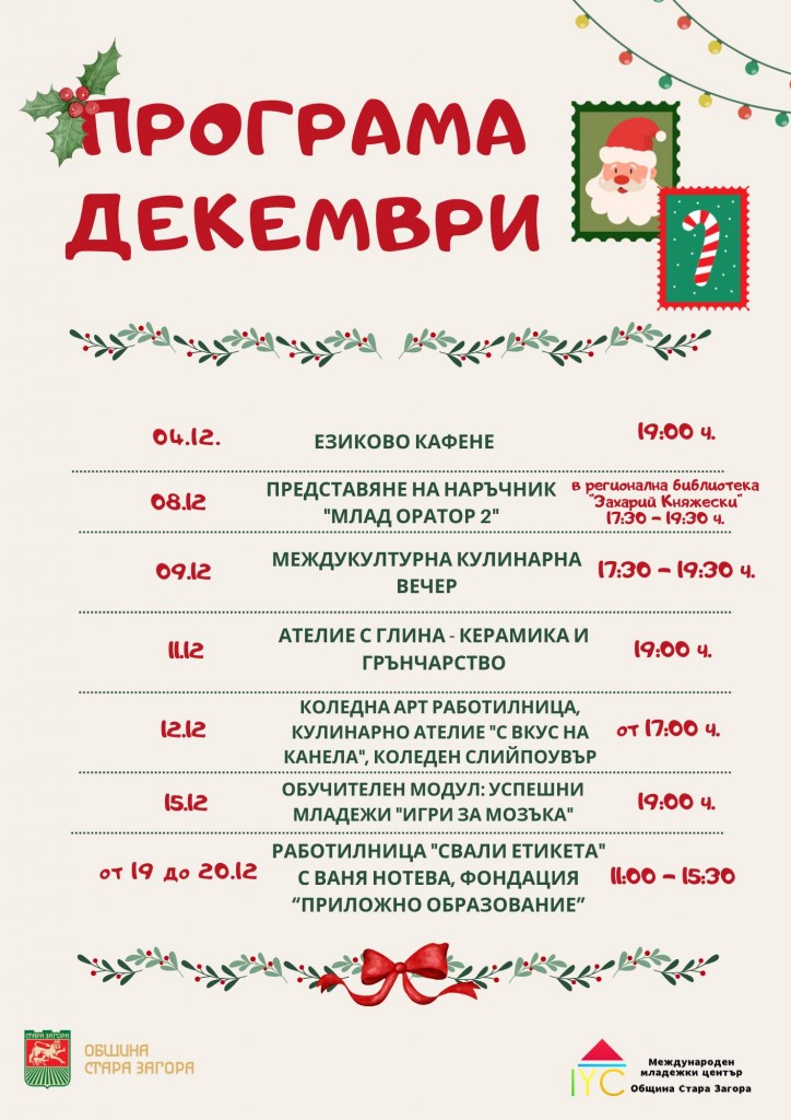 Международният младежки център – Стара Загора представя своята декемврийска програма, изпълнена с креативни работилници, тематични събития и обучителни модули, насочени към млади хора от града и региона.