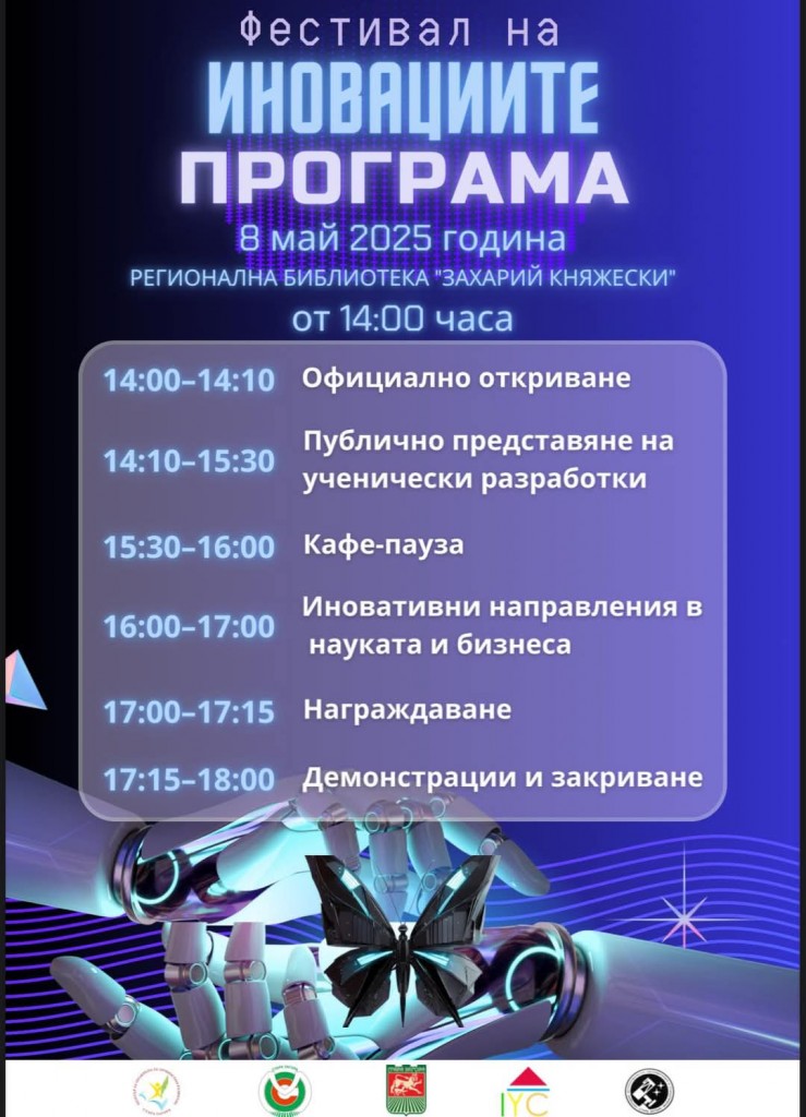 Първото издание на „Фестивала на иновациите“ ще се проведе в Стара Загора на 8 май 2025 г. от 14.00 ч. в Регионална библиотека „Захарий Княжески“. Форумът е посветен на младежкото творчество, технологичния напредък и сътрудничеството между образование, наука и бизнес.
