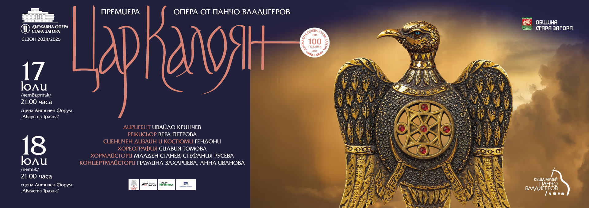 На 17 и 18 юли от 21.00 часа на сцената на Античния форум „Августа Траяна“ Старозагорската опера ще представи най-новата си продукция на операта „Цар Калоян“ от Панчо Владигеров. Знаковата българска творба ще оживее под звездите на Стара Загора и ще напомни със своята мащабност и оригинална интерпретация за събития, свързани с българската история през погледа на гения на композитора Панчо Владигеров, либретиста Николай Лилиев и великолепния първоизточник на разказа – театралната пиеса „Балдуиновата кула“ на Фани Попова-Мутафова. Старозагорската опера избира да постави именно това българско оперно заглавие в годината, когато чества своя 100-годишен юбилей, а сценографията е замислена и проектирана специално за сцената на Античния форум „Августа Траяна“. Къщата-музей „Панчо Владигеров“ – София – партньор на Старозагорската опера за премиерните спектакли на операта „Цар Калоян“, ще гостува в Стара Загора със специална изложба, която проследява историята на творбата и различните постановки през годините – от премиерата в Софийската опера през 1936 г. до днес у нас и в чужбина. Експозицията ще бъде изложена на Античната улица, непосредствено до входа към Античния форум за публиката. Автор на изложбата е Надя Сотирова, дизайн – Цветелина Панова. Официалното откриване е от 19.30 часа на 17 юли и изложбата ще бъде на разположение през двете премиерни вечери. След това ще отпътува за Велико Търново, където спектакълът на операта „Цар Калоян ще бъде представен на историческата сцена на хълма „Царевец“ на 25 юли – в рамките на десетото издание на Летния сезон на оперните театри „Сцена на вековете“ 2025.