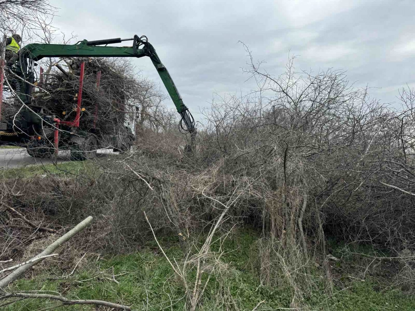 На снимката: По време на почистването на общинския път край с. Дълбоки от същата фирма, изрязаната и събрана растителност се товари на камион
