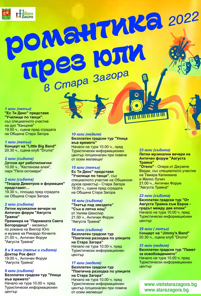 Инициативата за тематични събития, които да обагрят летните месеци с творчество, предлага програма, изпълнена с музика, театър, арт и градски обиколки. Месецът ще премине с мотото “Романтика през юли”. Началото му е в първия юлски ден с “Училище по танци” на “Ес Ти Денс”. Специално участие ще вземат дуо “Канцоне”. Танцовото шоу ще бъде на сцената пред Община Стара Загора, а началото е в 19.00 часа. Малко по-късно, в клуб “Drums” ще се случи концерт на “Little Big Band”.