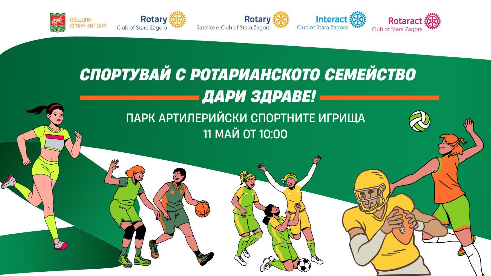 Благородна кауза, посветена на детското здраве, става повод за спортен празник на 11 май 2025 г., неделя, в парк „Артилерийски“ в Стара Загора. Началото е от 10.00 часа. Под мотото „Спортувай с Ротарианското семейство – дари здраве!“ няколко организации се обединяват с подкрепата на Община Стара Загора, а тяхната цел е да съберат средства за провеждане на безплатни очни прегледи за деца от детските градини в Стара Загора.