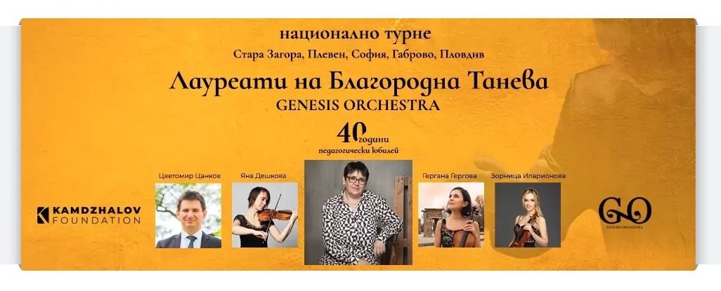 В концертите, дирижирани от изключителния маестро Йордан Камджалов, ще участват някои от най-известните ни цигулари – Зорница Иларионова, Яна Дешкова, Гергана Гергова и Цветомир Цанков, както и настоящи възпитаници на Благородна Танева от Национално музикално училище „Любомир Пипков“, заедно с уникалния GENESIS ORCHESTRA.